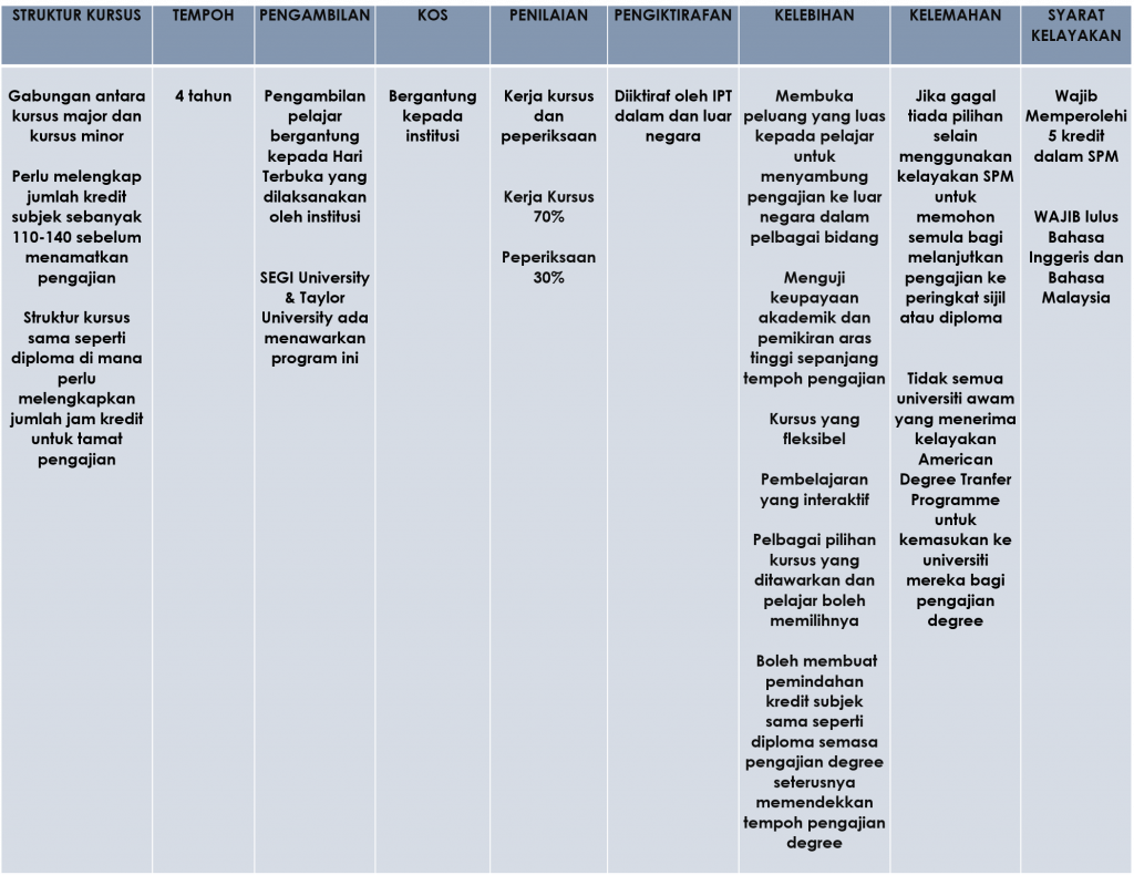 Oleh itu, kami kongsikan kepada anda perbandingan untuk semua iaitu 8 laluan yang wajib diambil bagi melayakkan anda menyambung pengajian ke peringkat ijazah (degree) seterusnya dianugerahkan segulung Ijazah Sarjana Muda (degree). Perbandingan adalah dari segi struktur kursus, tempoh pengajian, sesi pengambilan, kos pengajian, penilaian gred, pengiktirafan, kelebihan, kelemahan dan syarat kelayakan.